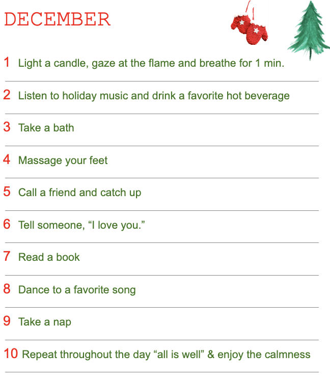 Wise Goddess, check below for a simple December calendar to enjoy. It is filled with small self-care ideas to gift your amazing self each day through Dec 24th. Hopefully, this helps you gain moments of peace and serenity during the hectic holidays. And allow yourself to experience less “Grinchy” moments as the year winds down!