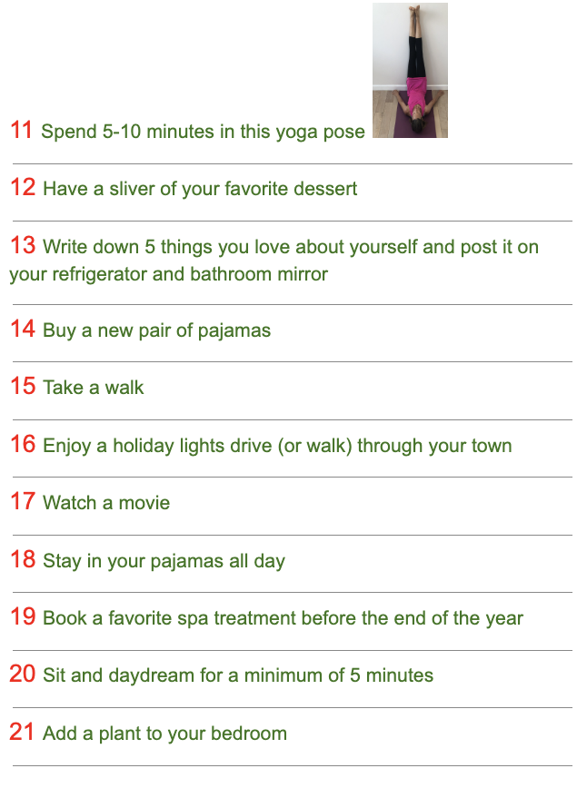 No pressure to make sure every day gets done, Wise Goddess. The point is to take time during what for many is a hectic month and nurture yourself. If you are loving the calendar, consider taking 7 of your favorite days and finishing the year with them!